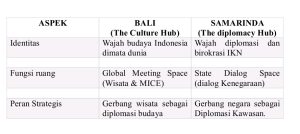 Terkait dengan IKN ini event diplomasi bisa diwakili oleh kota Samarinda yang mempu memiliki peran yang komparatif namun berbeda secara substansi, terlihat pada tabel di bawah ini: